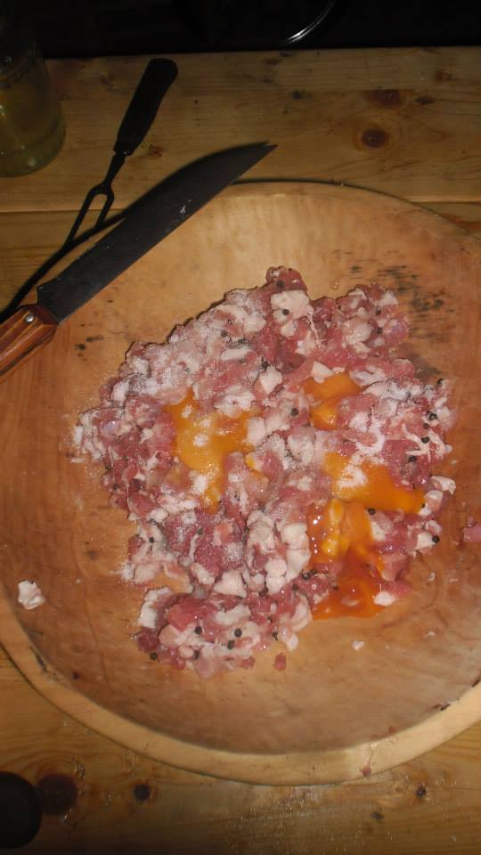 Mäso je pokrájané, osolené a okorenené a pridajú sa ešte žĺtky vajec, aby zmes držala pokope.
